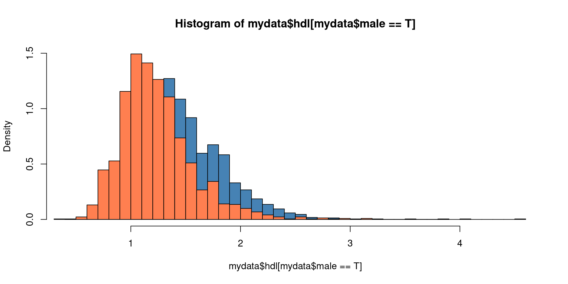 hist(mydata$hdl[mydata$male == T], breaks = 40, col = "steelblue", freq = F, ylim=c(0,1.5))